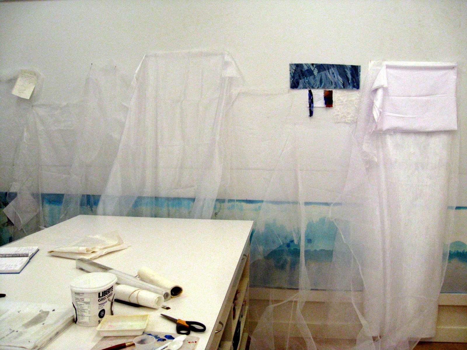 Pinning the different sheers on the wall gives me an idea of their transparency and drape.
