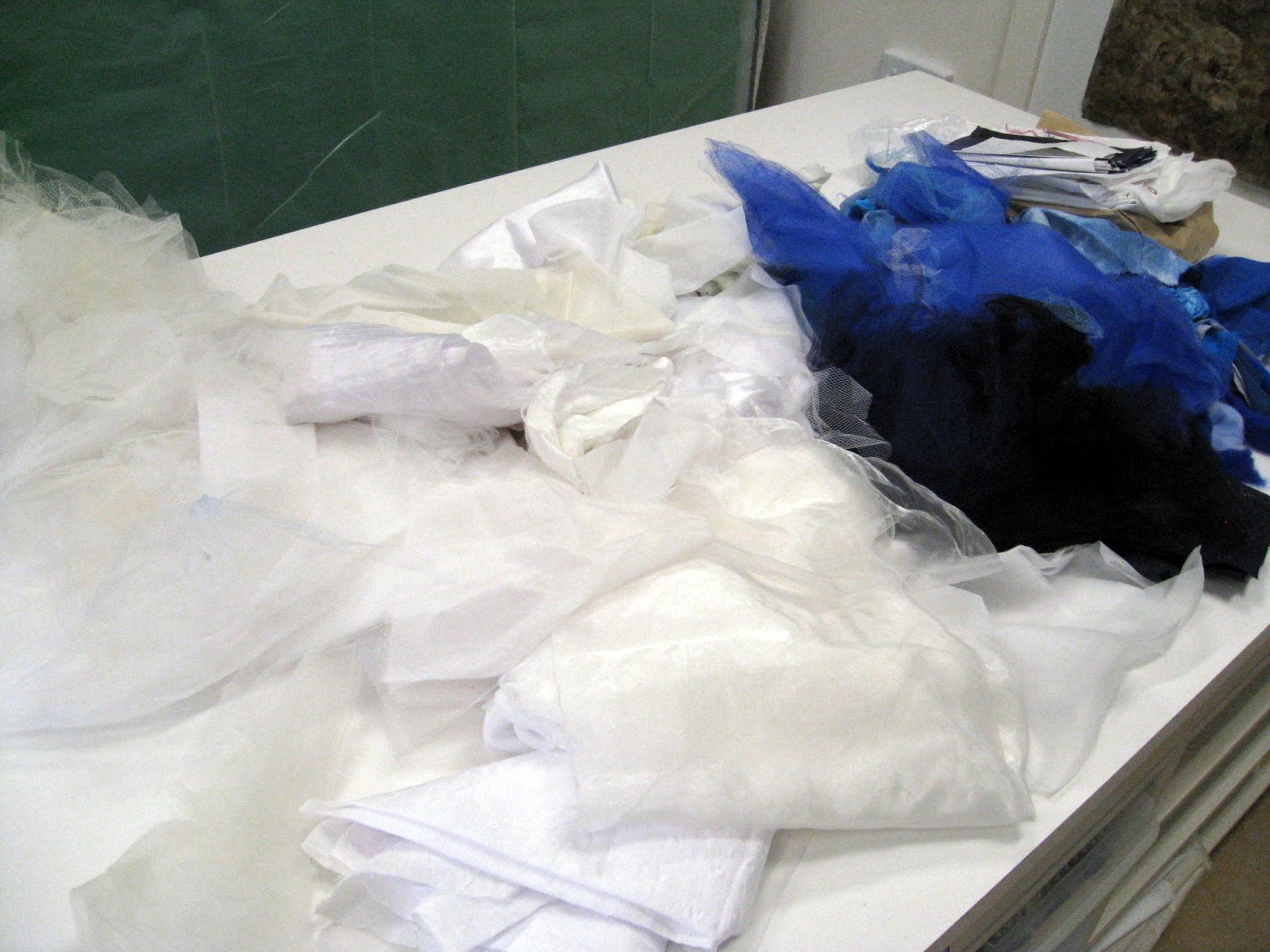 I haul out from my stash all of the light to sheer fabrics in those colours.