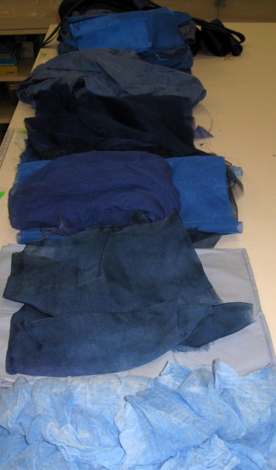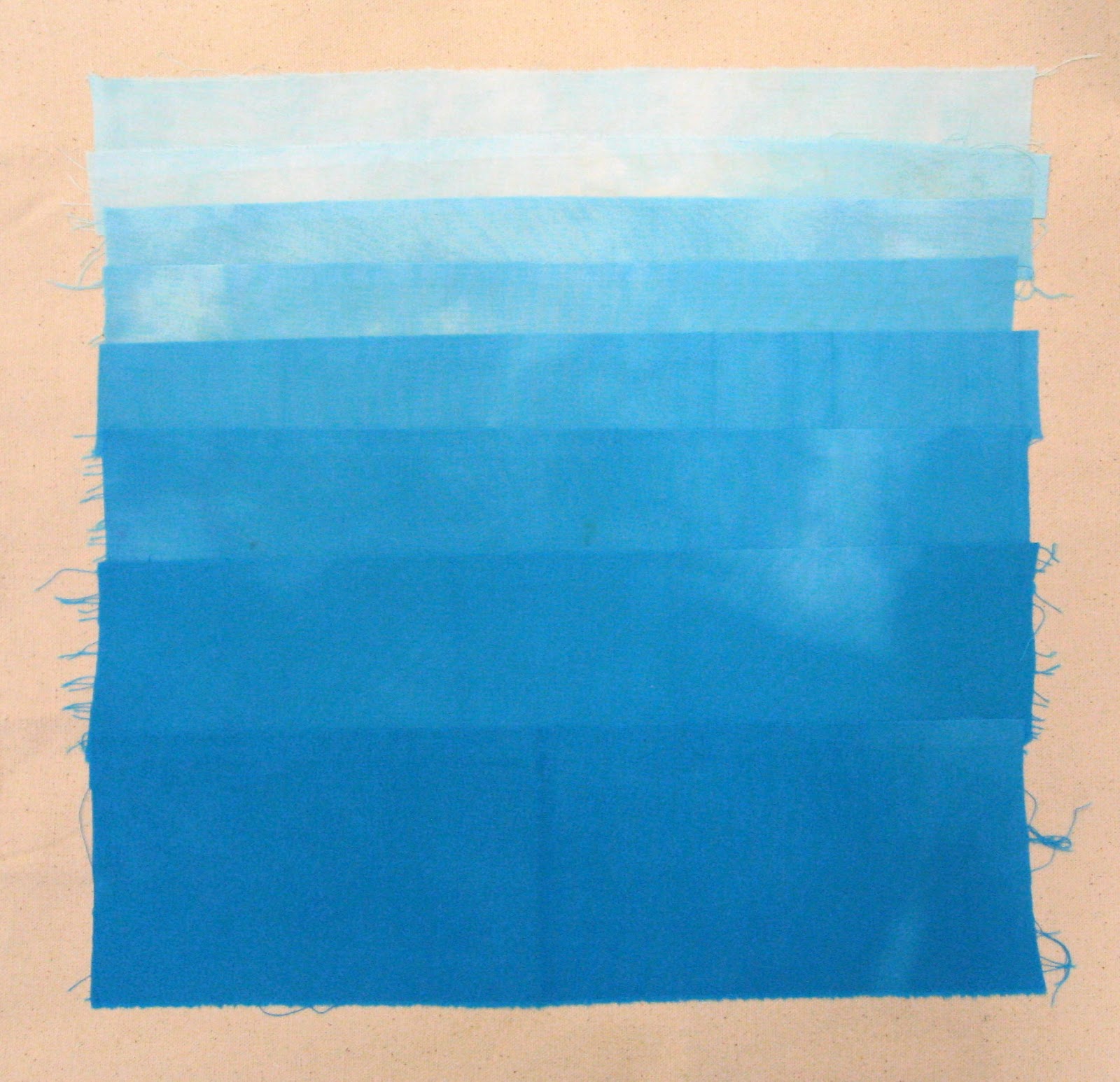 I am making colour cards to go with each Synesthesia work. The cards have strips of fabric glued to them. When I select the fabrics I aim for the maximum range of values, saturation, and cold-warm contrast because the purpose of the cards is to show the full range of the colour's properties.