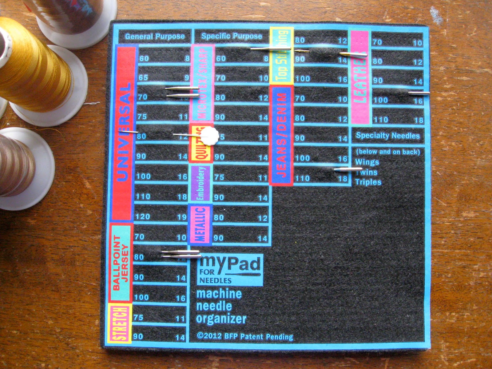 I don't know if you can see how it works in the above image. A piece of neoprene is printed with sections for different types of needles and has spaces within each section for different sizes. When I have a lightly used needle I park it in its matching area. The white headed pin is a marker telling me what sort of needle is currently in the machine. Like most systems, simple works best.